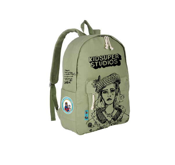 The backpacks came in five colorways and featured five screenprinted KidSuper Studios graphics, an embroidered 'Factory Worker' patch, a hand-sewn leather KMG Studio patch, a vintage KidSuper tag, and a KMG Studio x KidSuper numbered rolling paper droptag.
